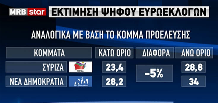 Στην πρόθεση ψήφου για τις επερχόμενες Ευρωεκλογές η διαφορά μεταξύ ΣΥΡΙΖΑ και Νέας Δημοκρατίας καταγράφεται στο 6,5% υπέρ της Πειραιώς. Η ΝΔ παίρνει το 29%, ο ΣΥΡΙΖΑ 22,5% και μετά ακολουθούν το ΚΙΝΑΛ με 6,8%, ΚΚΕ και Χρυσή Αυγή με 6%, η Ένωση Κεντρώων με 2,5% και το Ποτάμι με 2,4%.