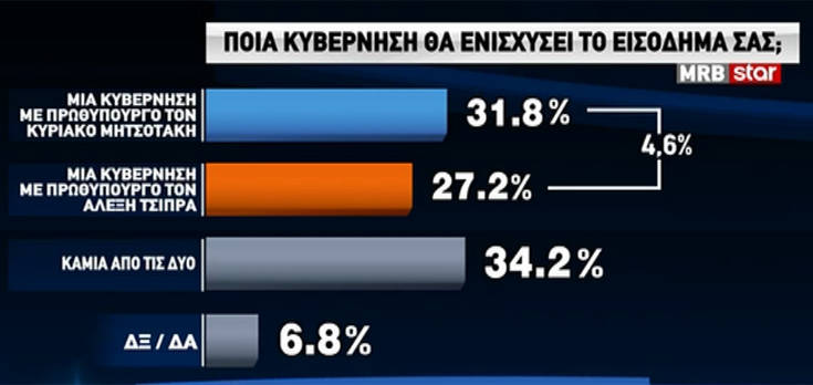 Ενδιαφέρον παρουσιάζουν και οι απαντήσεις στο ερώτημα «ποια κυβέρνηση θεωρείται ότι θα ενισχύσει στο εισόδημά σας;». Το 31,8% απαντά Κυριάκος Μητσοτάκης, το 27,2% Αλέξης Τσίπρας και 34,2% «κανένας».