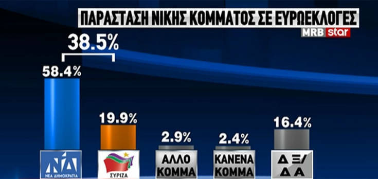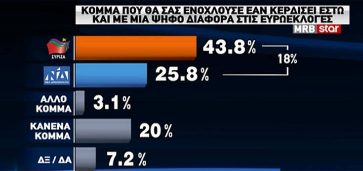 Στο ερώτημα «το κόμμα που θα θέλατε να κερδίσει έστω και με μία μονάδα τις ευρωεκλογές» οι πολίτες απάντησαν 34,2% ΝΔ, 22,8 ΣΥΡΙΖΑ, Κανένα κόμμα 28,7%. Αντίστοιχα στο ερώτημα «ποιο κόμμα θα σας ενοχλούσε αν κέρδιζε τις ευρωεκλογές» το 43,8% απάντησε ο ΣΥΡΙΖΑ και το 25,8% η ΝΔ.