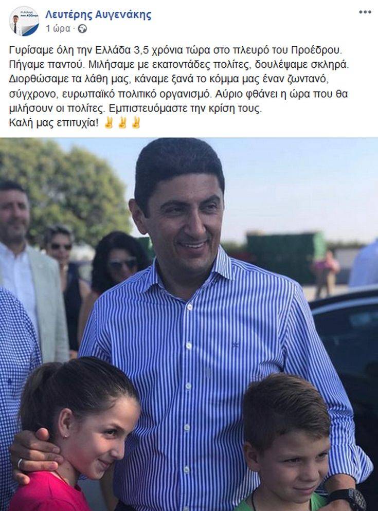 Ένα μήνυμα στους λογαριασμούς του στα social media ανάρτησε ο γραμματέας ΠΕ της Νέας Δημοκρατίας, Λευτέρης Αυγενάκης, λίγες ώρες πριν ανοίξουν οι κάλπες για τις ευρωεκλογές και τις δημοτικές και περιφερειακές εκλογές 2019.
