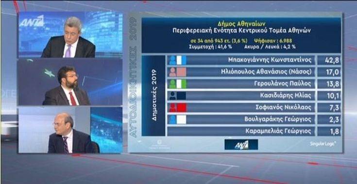 Σημαντικό προβάδισμα του Κώστα Μπακογιάννη στον δήμο Αθηναίων καταγράφουν τα πρώτα αποτελέσματα για τις δημοτικές εκλογές 2019.