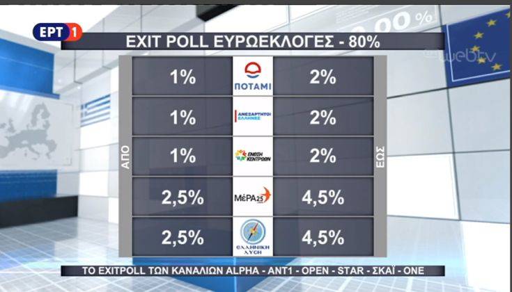 Exit poll: Με το κλείσιμο των καλπών την Κυριακή 26 Μαΐου 2019, στις 19:00, θα μεταδοθεί το κοινό exit poll 2019, δίνοντας μια πρώτη εικόνα της εκλογικής μάχης. Αμέσως μετά ξεκινά η μετάδοση των αποτελεσμάτων για τις Ευρωεκλογές, τις Δημοτικές και Περιφερειακές Εκλογές 2019 μέσω του υπουργείου Εσωτερικών και της Singular Logic.