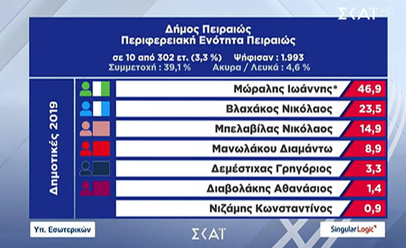 Τα πρώτα αποτελέσματα για τον Δήμο του Πειραιά δίνουν μεγάλη νίκη του υποψηφίου Δημάρχου Γιάννη Μώραλη με ποσοστό 46,9%.