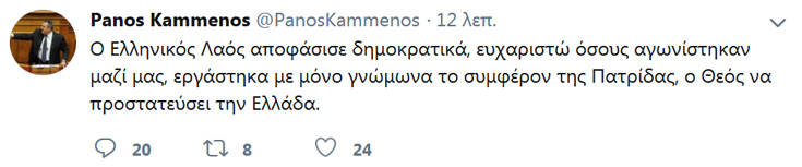 Τον ελληνικό λαό ευχαρίστησε μέσω Twitter ο πρόεδρος των ΑΝ.ΕΛ Πάνος Καμμένος, αποδεχόμενος την ήττα του.