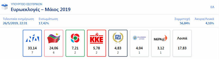 Αποτελέσματα Ευρωεκλογών 2019: Οι πολίτες άσκησαν το εκλογικό τους δικαίωμα και ψήφισαν στις Ευρωεκλογές 2019 για την ανάδειξη των προσώπων που θα αντιπροσωπεύουν τη χώρα μας στο Ευρωπαϊκό Κοινοβούλιο. Μια εκλογική μάχη, στην οποία Αλέξης Τσίπρας και Κυριάκος Μητσοτάκης έθεσαν διλήμματα εθνικών εκλογών. Η Ελλάδα εκλέγει συνολικά 21 αντιπροσώπους στο Ευρωπαϊκό Κοινοβούλιο, κατέχει δηλαδή 21 έδρες. Δείτε εδώ τα αποτελέσματα των Ευρωεκλογών 2019
