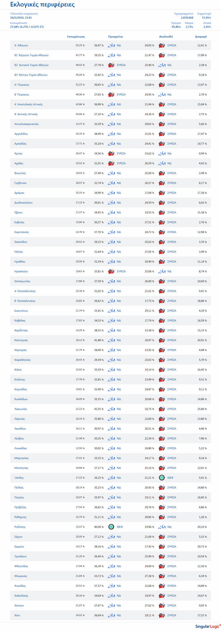 Με την ενσωμάτωση στο 27,7%, στις 23:41, ο ΣΥΡΙΖΑ καταγράφει το υψηλότερο ποσοστό μόλις σε πέντε εκλογικές περιφέρειες, στον Δυτικό Τομέα Αθηνών, στη Β’ Πειραιώς, στην Αχαΐα, στη γενέτειρα του Αλέξη Τσίπρα, την Άρτα, καθώς και στο Ηράκλειο. Επίσης, στη Ροδόπη πρώτο έρχεται το μουσουλμανικό Κόμμα Ισότητας Ειρήνης Φιλίας (ΚΙΕΦ).