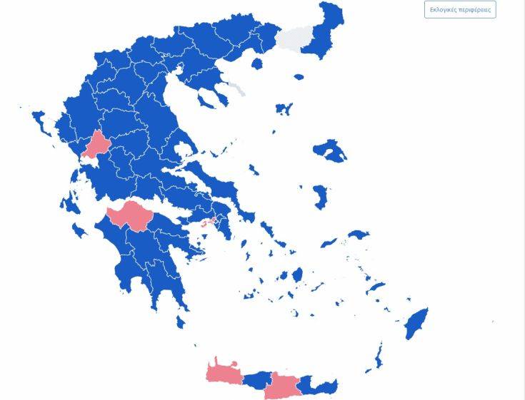 Η εικόνα των ποσοστών και της μεγάλης διαφοράς ανάμεσα στα δύο κόμματα αποτυπώνεται ξεκάθαρα και στον χάρτη της Ελλάδας ο οποίος έχει «βαφτεί» μπλε με μικρές εξαιρέσεις.