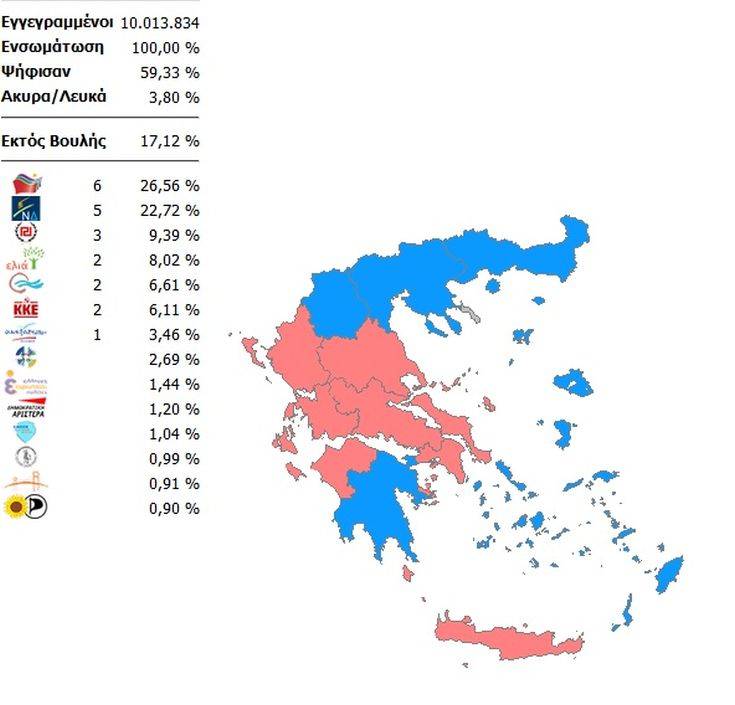 Σύμφωνα, λοιπόν, με τα μέχρι στιγμής αποτελέσματα, ο ΣΥΡΙΖΑ συγκεντρώνει 23,83% και 6 έδρες, η Νέα Δημοκρατία 33,25% και 7 έδρες, το ΚΙΝΑΛ 7,41% και 2 έδρες, το ΚΚΕ 5,60% και δυο έδρες, η Χρυσή Αυγή 4,84% και δυο έδρες, η Ελληνική Λύση 4,09% και μια έδρα και το ΜέΡΑ25 3,09% και μια έδρα. Επιπλέον η συμμετοχή στις εκλογές ξεπέρασε το 58,14%.