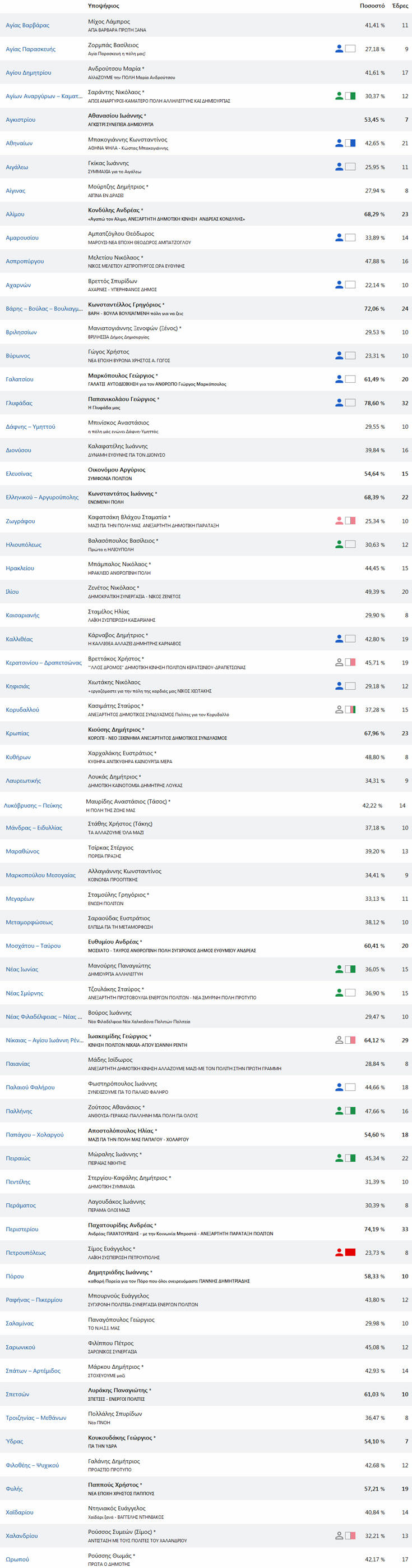 Οι 16 δήμοι στους οποίους εκλέγονται δήμαρχοι στην Αττική με ενσωματωμένο το 74% των ψήφων είναι οι εξής: