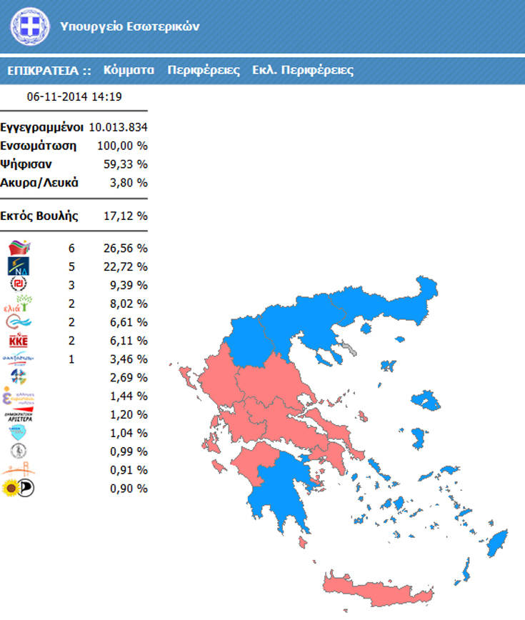 Στις ευρωεκλογές του 2014, νικητής αναδείχθηκε ο Συνασπισμός Ριζοσπαστικής Αριστεράς και δεύτερη δύναμη η Νέα Δημοκρατία. Τρίτη δύναμη αναδείχθηκε η Χρυσή Αυγή ενώ η αποχή άγγιξε το 40,03%.