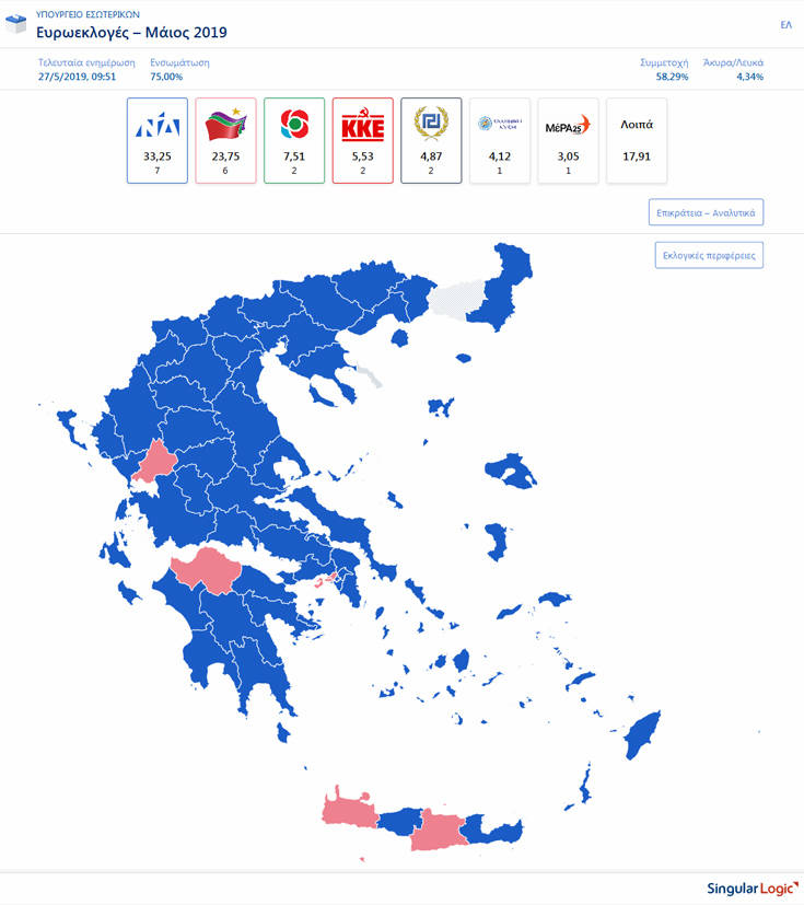 Στις Ευρωεκλογές 2019, η Νέα Δημοκρατία συγκεντρώνει μέχρι στιγμής ποσοστό 33,24% και ο ΣΥΡΙΖΑ φθάνει στο 23,74%. Στην τρίτη θέση βρίσκεται το Κίνημα Αλλαγής με 7,50%, πέμπτο είναι το ΚΚΕ με 5,54%, ενώ η Χρυσή Αυγή υποχωρεί στο 4,86%.
