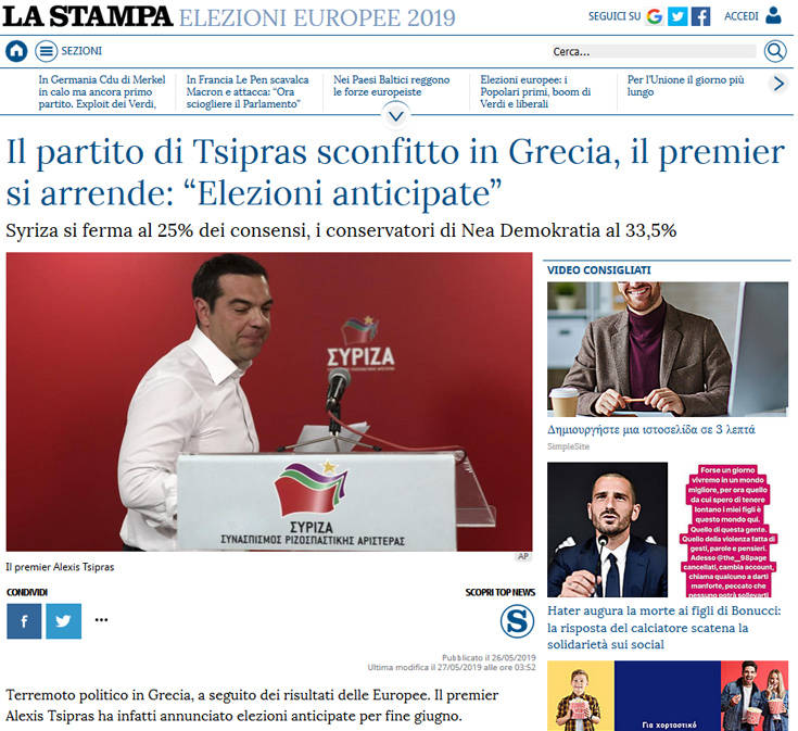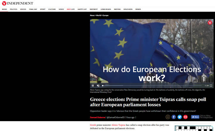 O Έλληνας πρωθυπουργός Αλ.Τσίπρας ανακοινώνει πρόωρες εκλογές μετά τις απώλειες στις ευρωεκλογές, γράφει ο βρετανικός Independent. Στην πορεία προς τις εκλογές ο κ. Τσίπρας έφερε στη Βουλή μια σειρά μέτρων που συμπεριέλαβαν επιδόματα και προκάλεσε τους συντηρητικούς να τα καταψηφίσουν, πράγμα που δεν έκαναν ωστόσο κατηγόρησαν τον Τσίπρα για απελπισμένο παιχνίδι ψήφων. Υπό φυσιολογικές συνθήκες, η θητεία του κ. Τσίπρα ολοκληρώνεται τον Οκτώβριο, ωστόσο, με την ανακοίνωσή του ο Έλληνας πρωθυπουργός τοποθετεί την εκλογική διαδικασία στις 30 Ιουνίου το νωρίτερο.