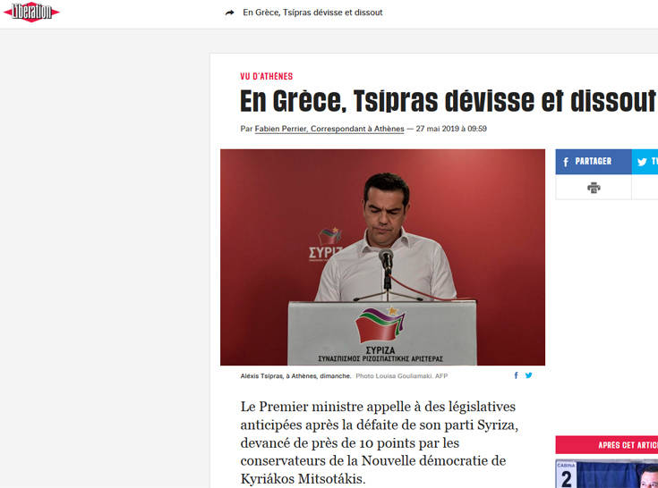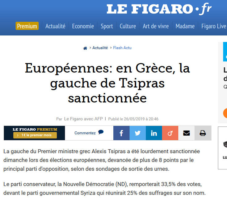Μεγάλη απογοήτευση για το κόμμα του Έλληνα πρωθυπουργού Αλέξη Τσίπρα, γράφει η γαλλική Le Figaro. Οι ευρωεκλογές αποτελούσαν τεστ πριν από τις βουλευτικές εκλογές, του ερχόμενου φθινοπώρου, αλλά το αριστερό κόμμα τιμωρήθηκε βαριά από το κύριο κόμμα της αντιπολίτευσης. Οι συντηρητικοί της Νέας Δημοκρατίας, με 33,28% των ψήφων, προηγήθηκαν κατά πολύ του κυβερνώντος Σύριζα, που κατάφερε να κερδίσει μόνο το 23,94% των ψήφων, σύμφωνα με τις εκτιμήσεις του Ευρωπαϊκού Κοινοβουλίου. Ωστόσο, ο Αλέξης Τσίπρας είχε πραγματοποιήσει μια επιχείρηση γοητείας του εκλογικού σώματος λίγες εβδομάδες νωρίτερα. Πρόσφατα ψήφισε στο Κοινοβούλιο μία σειρά μέτρων ανακούφισης, με στόχο να μειώσει την πίεση από την λιτότητα, που επιβάλλει η ΕΕ και το ΔΝΤ, εδώ και μια δεκαετία στην Ελλάδα, ενώ η αντιπολίτευση χαρακτήρισε τις ενέργειες αυτές ως «πολιτικό οπορτουνισμό» για την «αγορά» ψήφων. Τα αποτελέσματα αυτών των ευρωπαϊκών εκλογών αντικατοπτρίζουν επίσης τη δυσαρέσκεια των οπαδών Τσίπρα, οι οποίοι καταλογίζουν στο ΣΥΡΙΖΑ ότι μετακινήθηκε σταδιακά στο κέντρο. Αυτή η μετατόπιση απεικονίστηκε εξάλλου στο όνομα του κόμματος, που μετονομάστηκε σε Σύριζα-Προοδευτική Συμμαχία. Σε εθνικό επίπεδο, ο Τσίπρας κατηγορείται ότι πρόδωσε τις προεκλογικές του υποσχέσεις για να θέσει «τέλος στη λιτότητα» που ασφυκτιά τον πληθυσμό.Ο Τσίπρας εστίασε έτσι την προεκλογική του εκστρατεία στην υποστήριξη των «προοδευτικών δυνάμεων» που θα χρησίμευαν ως «ασπίδα» ενάντια στην άκρα δεξιά. Η κυβέρνηση του Τσίπρα αμφισβητήθηκε τέλος, όταν επικύρωσε τη συμφωνία των Πρεσπών τον Ιούνιο του 2018, η οποία έθεσε τέλος σε 25 χρόνια διαμάχης σχετικά με το όνομα της γειτονικής πρώην πΓΔΜ Γ, η οποία μετονομάσθηκε σε Βόρεια Μακεδονία. Η υπόθεση αυτή, προκάλεσε έντονες εθνικιστικές αντιδράσεις, εκτιμά η γαλλική εφημερίδα.