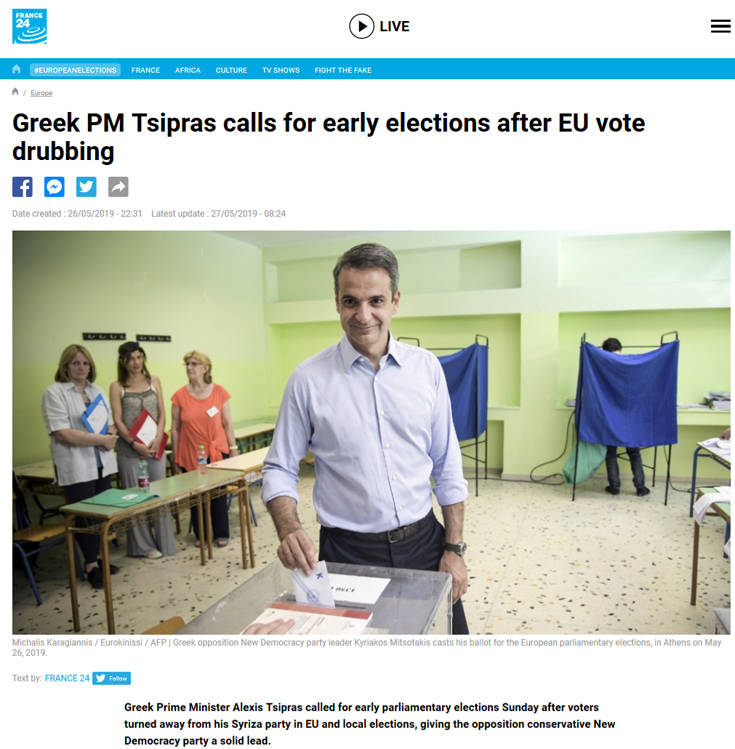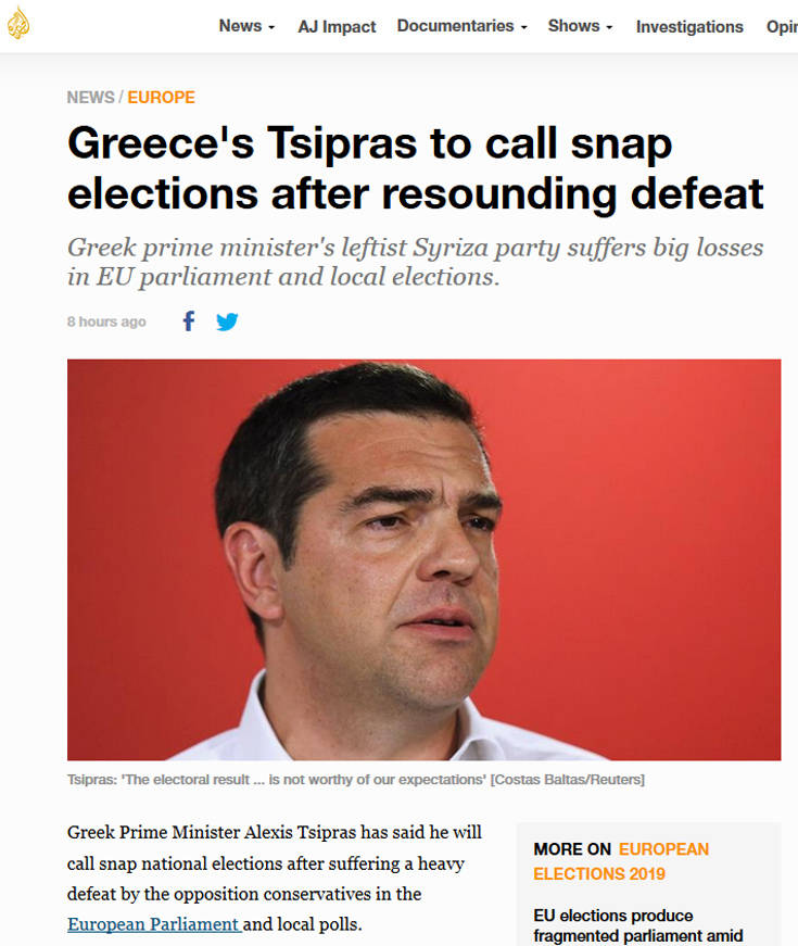 Ο Έλληνας Πρωθυπουργός Αλέξης Τσίπρας προκήρυξε αιφνίδια πρόωρες εθνικές εκλογές χθες το βράδυ μετά τη βαριά ήττα που υπέστη το κόμμα του στις Ευρωεκλογές. Ο 44χρονος Αλέξης Τσίπρας ήταν ο μακροβιότερος πρωθυπουργός κατά τη διάρκεια της παρατεταμένης κρίσης στην Ελλάδα και η θητεία του έληγε τον Οκτώβριο. Ο ΣΥΡΙΖΑ, ένα λαϊκιστικό κίνημα κατά του κεφαλαίου ανήλθε στην εξουσία το 2015 κατά τη διάρκεια της βαθιάς οικονομικής ύφεσης. Το κόμμα αμφισβήτησε την αυστηρή δημοσιονομική πολιτική που επιβλήθηκε από τους διεθνείς πιστωτές στο πλαίσιο των προγραμμάτων διάσωσης. Η οικονομία της Ελλάδας παραμένει η πιο εύθραυστη στην ευρωζώνη. Ο Έλληνας Πρωθυπουργός απέσπασε επαίνους από τις ΗΠΑ και την Ευρώπη για τη διαπραγμάτευση και τη συμφωνία με τη Βόρεια Μακεδονία, με αντάλλαγμα την είσοδο της μικρής χώρας στο ΝΑΤΟ. Η Ελλάδα για δεκαετίες απέρριπτε την ονομασία «Μακεδονία» για τη γειτονική χώρα και ασκούσε βέτο για την ένταξη των Σκοπίων στη Συμμαχία. Ο συμβιβασμός για την ονομασία είχε πολιτικό κόστος για τον Αλ. Τσίπρα, πυροδοτώντας μαζικές διαδηλώσεις και μειώνοντας το ποσοστό του κόμματός του στις ευρωεκλογές. Η Νέα Δημοκρατία, που είχε ταχθεί κατά της συμφωνίας απεκόμισε πολιτικό όφελος χθες, ιδίως στη βόρεια Ελλάδα, όπου νίκησε τον ΣΥΡΙΖΑ με 20% διαφορά σε πολλές περιοχές.