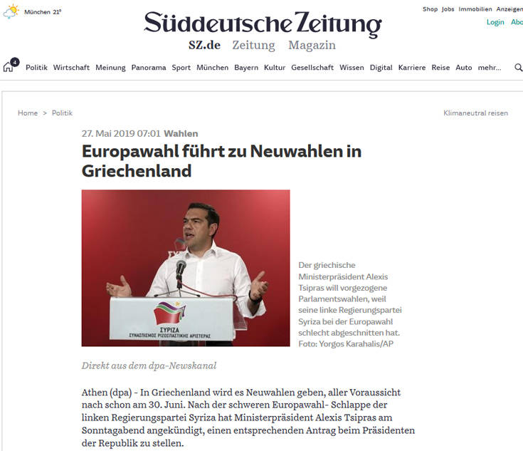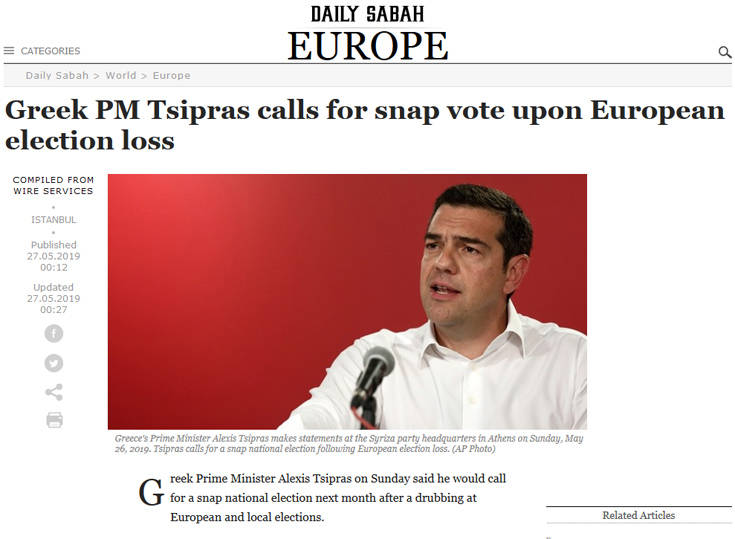 Στις πολιτικές εξελίξεις στην Ελλάδα, με την προκήρυξη πρόωρων εκλογών μετά την ήττα του ΣΥΡΙΖΑ στις ευρωεκλογές, αναφέρονται τα δημοσιεύματα του διεθνούς Τύπου.