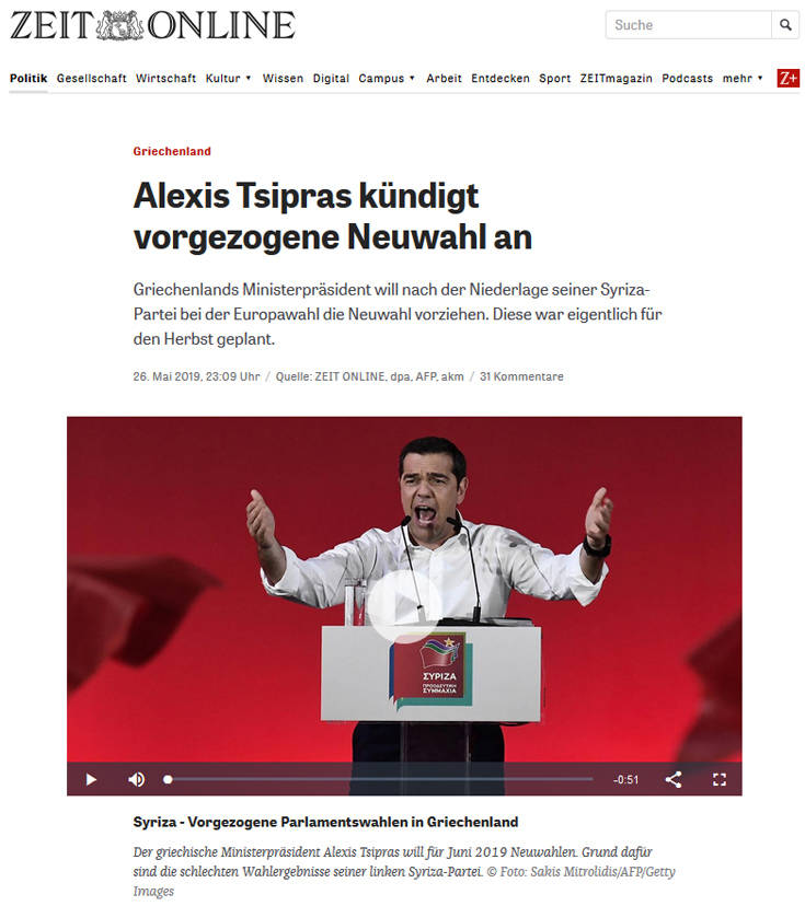 O πρωθυπουργός της Ελλάδας Τσίπρας ανακοινώνει πρόωρες εκλογές. Μετά τις σοβαρές απώλειες στις ευρωεκλογές ο Έλληνας Πρωθυπουργός Αλέξης Τσίπρας βλέπει συνέπειες και θέλει να επισπεύσει τις προγραμματισμένες για τον Οκτώβριο βουλευτικές εκλογές. Η αιτία είναι η κακή εμφάνιση του ΣΥΡΙΖΑ στις ευρωεκλογές, όπως δήλωσε ο ίδιος χθες το βράδυ στην Αθήνα, ενώ επεσήμανε ότι δεν μπορεί να αγνοήσει την κακή εμφάνιση του κόμματός του. Μετά από τις απώλειες στις ευρωεκλογές ο Τσίπρας δήλωσε πλέον ότι μετά τις δημοτικές εκλογές της 2ας Ιουνίου θα υποβάλει στον Πρόεδρο της Δημοκρατίας το αντίστοιχο αίτημα. Αντί για τις αρχικά προβλεπόμενες εκλογές τον Οκτώβριο, αυτές θα διενεργηθούν πλέον στα τέλη Ιουνίου.