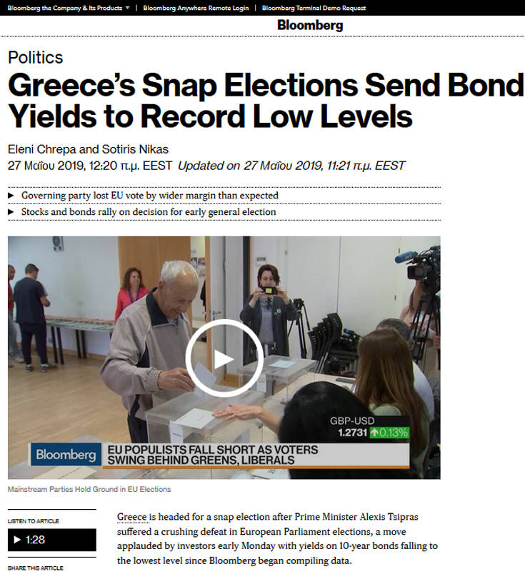 «Η Ελλάδα οδεύει προς πρόωρες εθνικές εκλογές μετά την συντριπτική ήττα που υπέστη χθες ο πρωθυπουργός, Αλέξης Τσίπρας, στις ευρωεκλογές» γράφει το πρακτορείο Bloomberg. «Ο Τσίπρας έχει αποδείξει ότι ξέρει να επιβιώνει πολιτικά, τώρα όμως θα δυσκολευτεί πολύ να παραμείνει εντός παιχνιδιού μετά από τέτοια ήττα. Εκτοξεύτηκε στην εξουσία το 2015 και οδήγησε την καταχρεωμένη Ελλάδα σε σύγκρουση με τους πιστωτές της, για να υποχωρήσει μόνον αφού προηγουμένως είχε φλερτάρει με την έξοδο από την ευρωζώνη. Η χώρα βρίσκεται ξανά σε διαφωνίες με τους πιστωτές και το ΔΝΤ, μετά την ανακοίνωση από τον Τσίπρα σειράς μέτρων ανακούφισης, μεταξύ των οποίων η μείωση του στόχου για το πρωτογενές πλεόνασμα. Οι εθνικές εκλογές θα αναβάλουν προς το παρόν την όποια σύγκρουση με τους πιστωτές. Η Νέα Δημοκρατία, που μάλλον θα σχηματίσει την επόμενη κυβέρνηση, πιθανότατα θα πρέπει να επανεξετάσει τις παροχές που υποσχέθηκε ο Τσίπρας μέχρι το 2020» εκτιμά το Bloomberg.