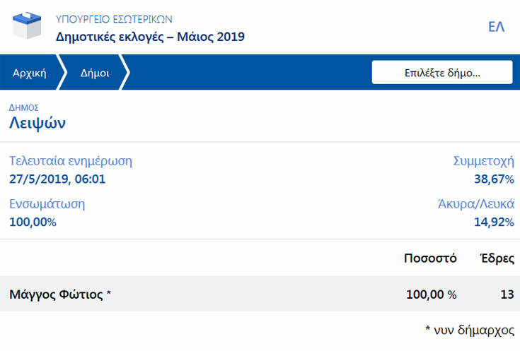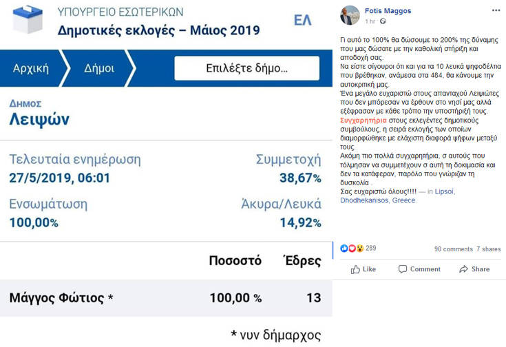 Εκτός από την Μαρία Κακαλή στον Άγιο Ευστράτιο που βγήκε με το 100% των ψήφων και υπήρξε άλλος ένα υποψήφιος Δήμαρχος που πήρε το απόλυτο των ψήφων.