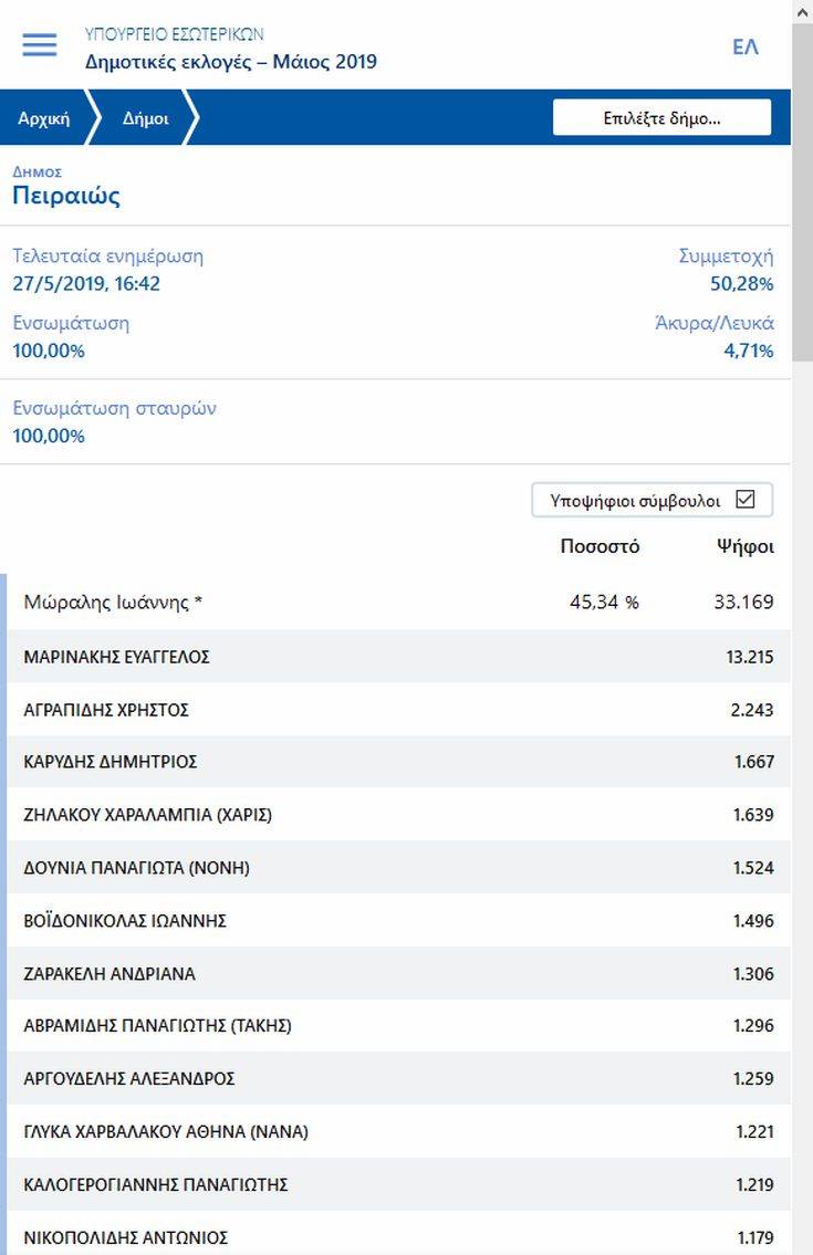 Σαρωτική ήταν η επικράτηση του Βαγγέλη Μαρινάκη στη μάχη του σταυρού στον Δήμο Πειραιά. Στο 100% της ενσωμάτωσης ο Βαγγέλης Μαρινάκης πήρε 13.190 ψήφους με τον συνδυασμό το δημάρχου Γιάννη Μώραλη.