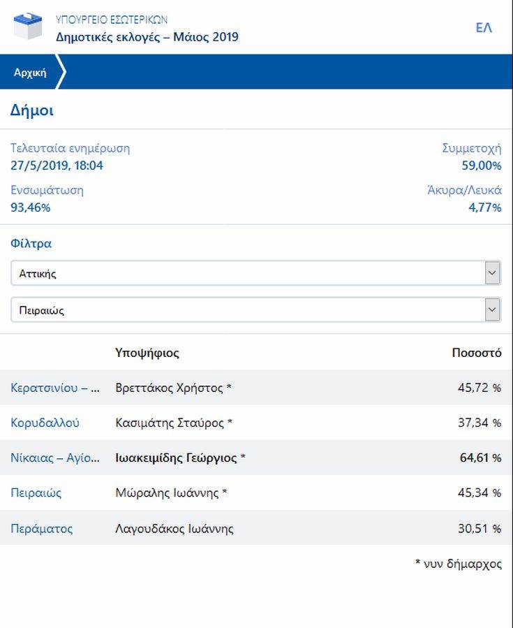 Αποτελέσματα Δημοτικών Εκλογών 2019: Η εκλογική μάχη της πρώτης Κυριακής για τις Δημοτικές Εκλογές 2019 ολοκληρώθηκε. Ποιοι εκλέγονται δήμαρχοι και δημοτικοί σύμβουλοι; Δείτε εδώ τα αποτελέσματα των Δημοτικών Εκλογών 2019