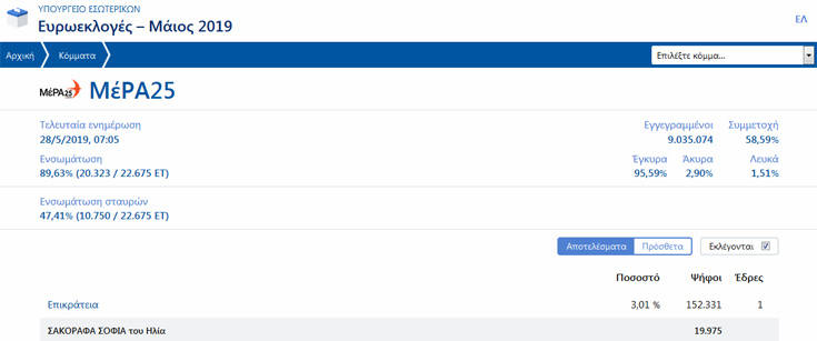 Με την ενσωμάτωση να έχει φτάσει στο 89,63 (έχει γίνει καταμέτρηση στα 20.323 από τα 22.675 εκλογικά τμήματα) και την ενσωμάτωση των σταυρών στο 47,41% (σε λιγότερα από τα μισά εκλογικά τμήματα, συγκεκριμένα σε 10.750), το ΜέΡΑ 25 φαίνεται να μπαίνει στην ευρωβουλή, έστω και οριακά, και να εκλέγει έναν βουλευτή.