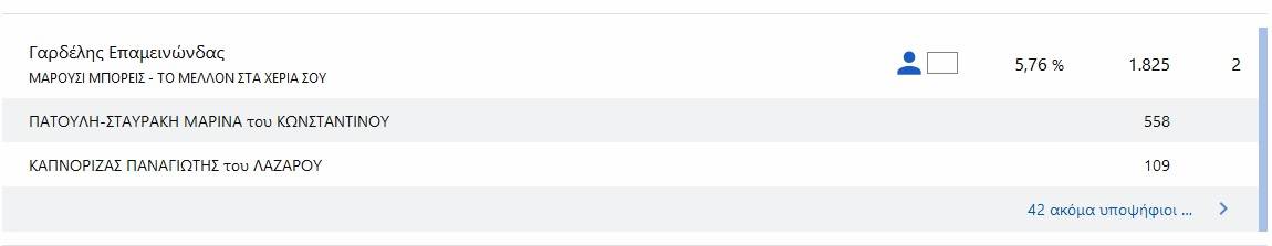 Δεύτερος, μετά την Μαρίνα Πατούλη, έρχεται ο Παναγιώτης Καπνόριζας με 109 σταυρούς με την ενσωμάτωση να είναι στο 99,11%.