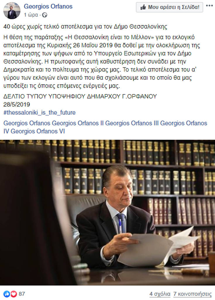«Η θέση της παράταξης “Η Θεσσαλονίκη είναι το Μέλλον” για το εκλογικό αποτέλεσμα της Κυριακής 26 Μαΐου 2019 θα δοθεί με την ολοκλήρωση της καταμέτρησης των ψήφων από το Υπουργείο Εσωτερικών για τον Δήμο Θεσσαλονίκης.