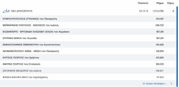 Μάχη για την 8η αυτή έδρα της Πειραιώς δίνουν Γιώργος Αμυράς και Θοδωρής Ζαγοράκης, που συγκεντρώνουν 109.259 και 108.921 ψήφους αντίστοιχα.