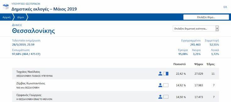 Σύμφωνα με τα τελευταία στοιχεία του υπουργείου Εσωτερικών – όπου πάντως η ενσωμάτωση έχει σταματήσει από χθες το βράδυ – ο Κωνσταντίνος Ζέρβας συγκεντρώνει ποσοστό 14,92% και 17.983 ψήφους και ο Γιώργος Ορφανός ποσοστό 14,50% και 17.473 ψήφους. Η διαφορά τους δηλαδή είναι μόλις 0,42% και 510 ψήφοι.