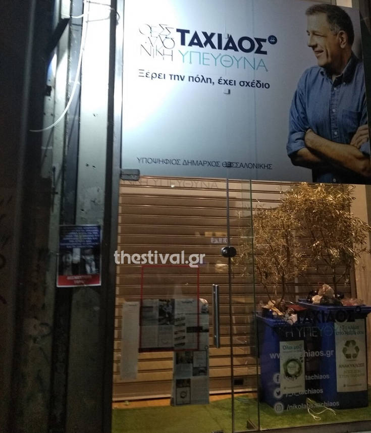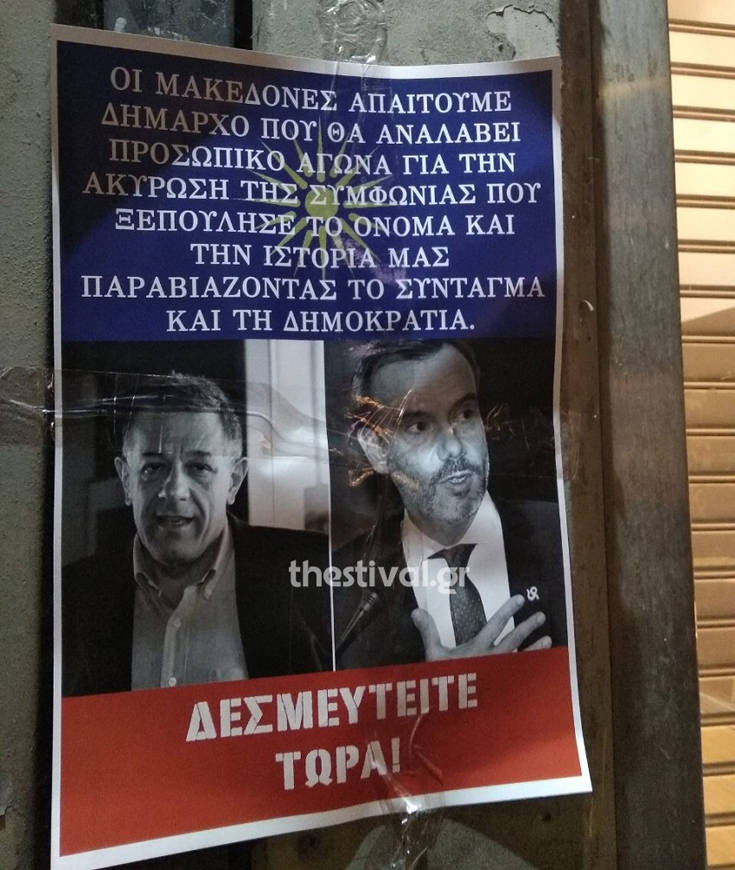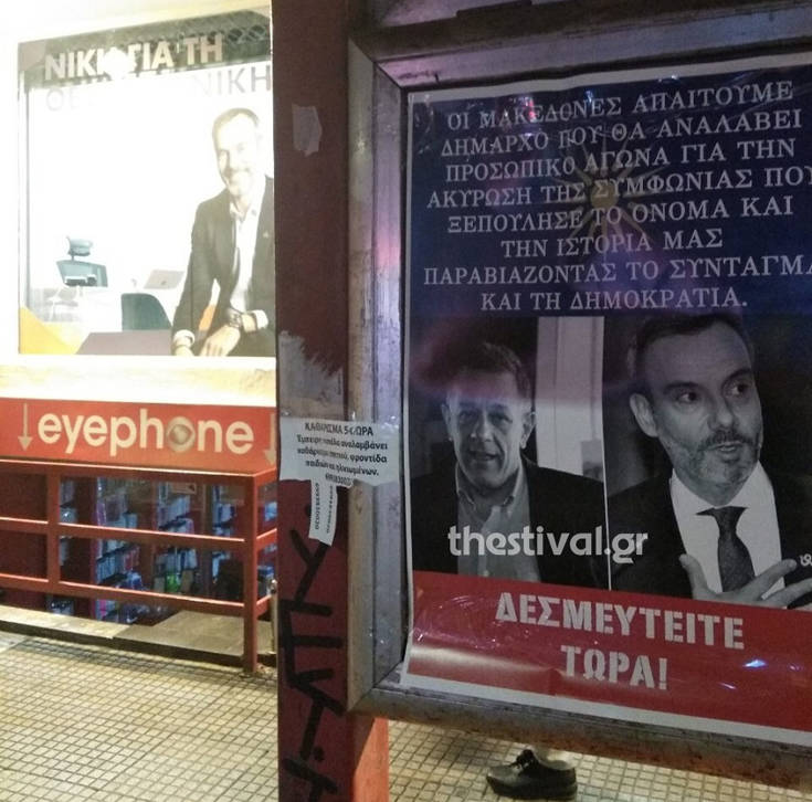 Αφίσες με τις οποίες καλούν τους δύο διεκδικητές του Δήμου Θεσσαλονίκης, Νίκο Ταχιάο και Κωνσταντίνο Ζέρβα, να αγωνιστούν για την ελληνικότητα της Μακεδονίας και την ακύρωση της Συμφωνίας των Πρεσπών, τοιχοκόλλησαν άγνωστοι στο κέντρο της πόλης.