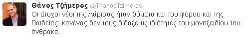 Την τραγωδία στη Λάρισα με τον θάνατο δύο φοιτητών που άναψαν αυτοσχέδιο μαγκάλι για να ζεσταθούν, σχολίασε στο twitter ο Θάνος Τζήμερος.
