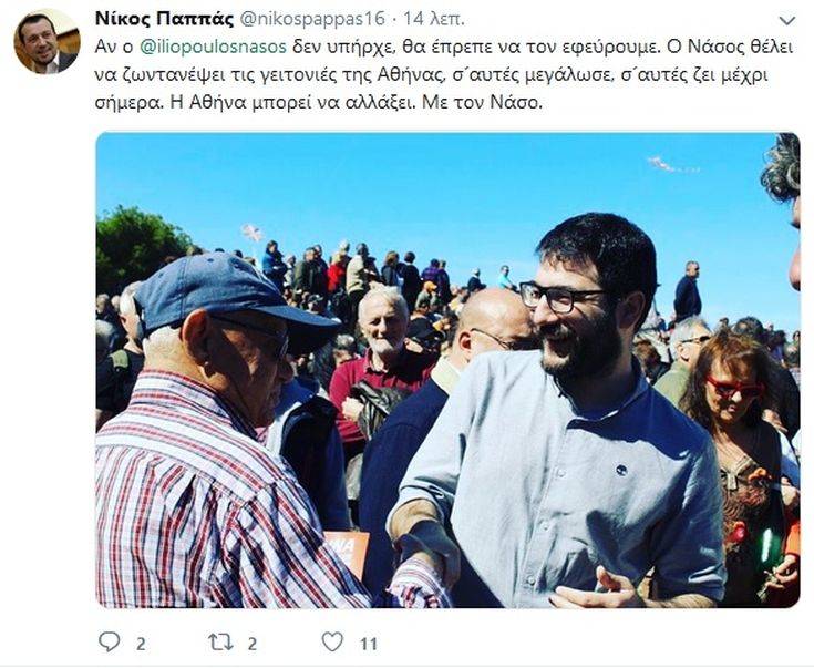 «Αν ο Νάσος Ηλιόπουλος δεν υπήρχε, θα έπρεπε να τον εφεύρουμε. Ο Νάσος θέλει να ζωντανέψει τις γειτονιές της Αθήνας, σε αυτές μεγάλωσε, σε αυτές ζει μέχρι σήμερα. Η Αθήνα μπορεί να αλλάξει. Με τον Νάσο» αναφέρει στο σχόλιό του ο κ. Παππάς.