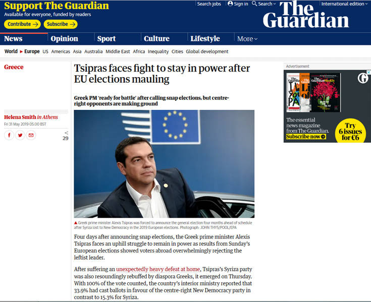 «Μετά την απροσδόκητα βαριά ήττα του, ο ΣΥΡΙΖΑ φαίνεται πως απορρίφθηκε και από τους Έλληνες του εξωτερικού. Με καταμετρημένο το 100% των ψήφων, κατά το υπουργείο Εσωτερικών, ποσοστό 33,9% ψήφισε τη Νέα Δημοκρατία, έναντι 15,3% του ΣΥΡΙΖΑ» γράφει ο Guardian.