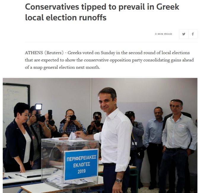 Σύμφωνα με το Reuters, ο δεύτερος γύρος των δημοτικών και περιφερειακών εκλογών στη χώρα αναμένεται να παγιώσει τα κέρδη της Νέας Δημοκρατίας ενόψει των πρόωρων εκλογών της 7ης Ιουλίου.