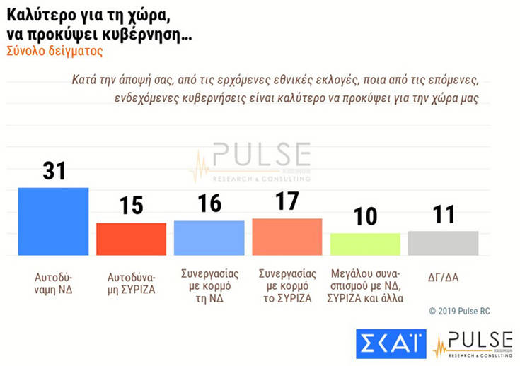 Στο ερώτημα ποια από τις ενδεχόμενες κυβερνήσεις είναι καλύτερο να προκύψει για την χώρα μετά τις εθνικές εκλογές το 31% απαντά με αυτοδυναμία της ΝΔ. Το 17% επέλεξε κυβέρνηση συνεργασίας με κορμό τον ΣΥΡΙΖΑ και το 16% κυβέρνηση συνεργασίας με κορμό την ΝΔ. το 15% απάντησε θεωρεί καλύτερη λύση την αυτοδυναμία του ΣΥΡΙΖΑ και 10% ευνοεί έναν μεγάλο συνασπισμό με ΝΔ, ΣΥΡΙΖΑ και άλλα κόμματα. Το 11% δήλωσε ότι δεν γνωρίζει/δεν απαντά.