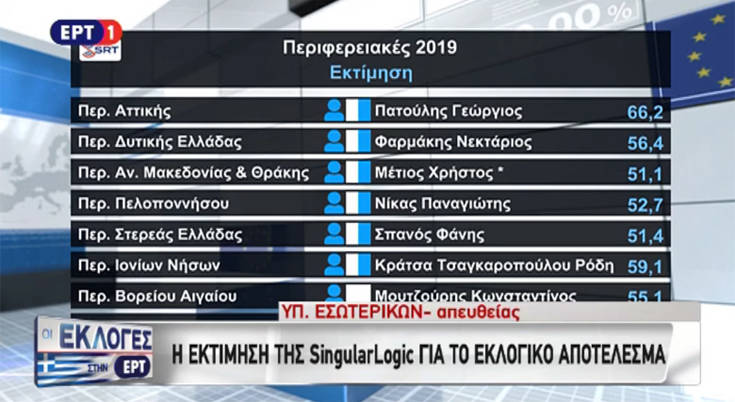 Ειδικότερα, μπλε βάφτηκαν έξι περιφέρειες της Ελλάδας, από τις εφτά που είχαν οδηγηθεί στον δεύτερο γύρο των αυτοδιοικητικών εκλογών, σύμφωνα με εκτίμηση της Singular Logic.