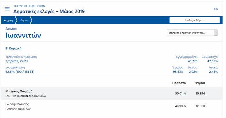 Ένα εκλογικό θρίλερ βρίσκεται σε εξέλιξη στα Ιωάννινα, όπου η διαφορά των δύο υποψήφιων δημάρχων είναι μόλις 6 ψήφοι στο 62,11% της ενσωμάτωσης.