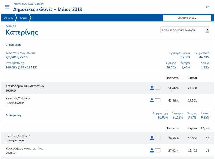 Στην Α’ Κυριακή των εκλογών, στην πρώτη θέση είχε αναδειχθεί ο μέχρι σήμερα δήμαρχος Κατερίνης Σάββας Χιονίδης, με ποσοστό 30,56% ενώ ο Κώστας Κουκοδήμος είχε βγει δεύτερος με ποσοστό 27,42%.