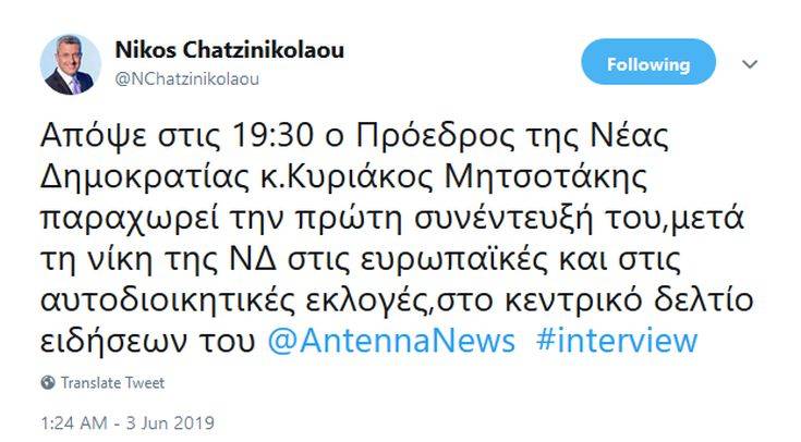 «Απόψε στις 19:30 ο Πρόεδρος της Νέας Δημοκρατίας κ.Κυριάκος Μητσοτάκης παραχωρεί την πρώτη συνέντευξή του, μετά τη νίκη της ΝΔ στις ευρωπαϊκές και στις αυτοδιοικητικές εκλογές, στο κεντρικό δελτίο ειδήσεων του @AntennaNews», ανέφερε σε μήνυμά του στο Twitter ο δημοσιογράφος και παρουσιαστής του κεντρικού δελτίου ειδήσεων του καναλιού Νίκος Χατζηνικολάου.