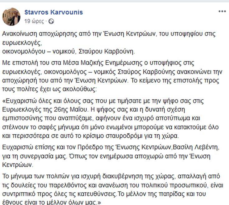 Μία ακόμη απώλεια για την Ένωση Κεντρώων, καθώς με μια επιστολή του στα Μέσα Μαζικής Ενημέρωσης, ο υποψήφιος στις ευρωεκλογές, οικονομολόγος – νομικός Σταύρος Καρβούνης, ανακοίνωσε την αποχώρησή του από το κόμμα.