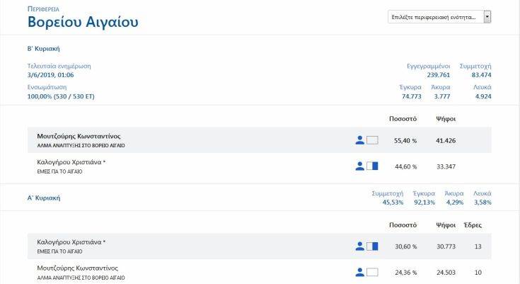 Κάτι αντίστοιχο συμβαίνει και στην Περιφέρεια Βορείου Αιγαίου, όπου ο Κωνσταντίνος Μουτζούρης έκανε επίσης την ανατροπή και από δεύτερος βγήκε τελικά περιφερειάρχης, αφήνοντας στη δεύτερη θέση τη Χριστιάνα Καλογήρου. Στο περιφερειακό συμβούλιο όμως θα έχει τρεις συμβούλους λιγότερους από την «αντίπαλό» του, καθώς σύμφωνα με τις επιδόσεις του πρώτου γύρου και την απλή αναλογική, η Καλογήρου καταλαμβάνει 13 έδρες και ο Μουτζούρης δέκα.