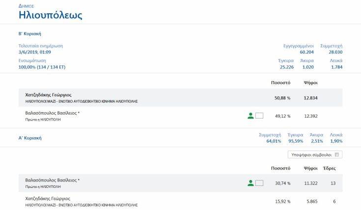 Από τα πιο χαρακτηριστικά παραδείγματα είναι και αυτό του δήμου Ηλιούπολης, όπου ο νέος δήμαρχος Γιώργος Χατζηδάκης εξασφάλισε στον πρώτο γύρο ποσοστό 15,92% και 6 έδρες, σε αντίθεση με τον αντίπαλό του Βασίλειο Βαλασόπουλο, ο οποίος κατέχει 13 έδρες, παρότι στον δεύτερο γύρο ήρθε δεύτερος.