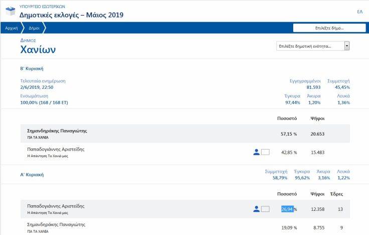 Στα Χανιά, ο νέος δήμαρχος Παναγιώτης Σημανδηράκης θα έχει εννέα έδρες στο δημοτικό συμβούλιο, τέσσερις λιγότερες από τον Αριστείδη Παπαδογιάννη, ο οποίος με το 26,94% του πρώτου γύρου αποσπά 13 έδρες.