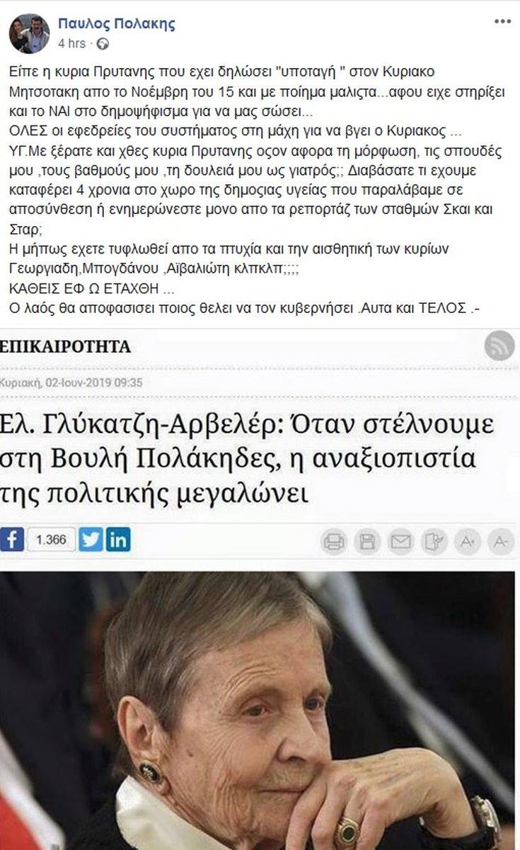 Αναλυτικότερα, στην ανάρτησή του, ο Παύλος Πολάκης τονίζει: «Είπε η κυρία Πρύτανης που έχει δηλώσει «υποταγή» στον Κυριάκο Μητσοτάκη από τον Νοέμβρη του ’15, και με ποίημα μάλιστα… αφού είχε στηρίξει και το ΝΑΙ στο δημοψήφισμα για να μας σώσει…
