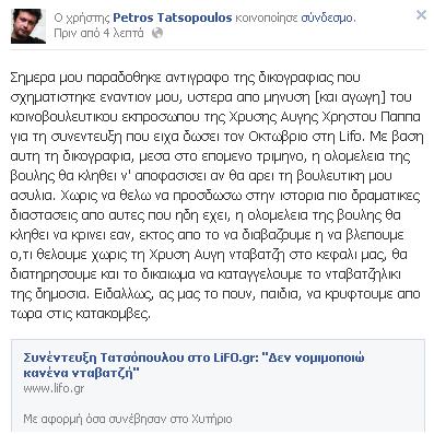 Μήνυση και αγωγή κατέθεσε ο βουλευτής της Χρυσής Αυγής,Χρήστος Παππάς εναντίον του βουλευτή του ΣΥΡΙΖΑ, Πέτρου Τατσόπουλου για τη συνέντευξη που είχε δώσει τον Οκτώβριο στη lifo.