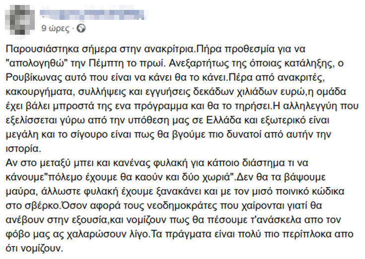 Επίθεση στη Νέα Δημοκρατία κάνει μέσω Facebook ηγετικό στέλεχος του Ρουβίκωνα, με αφορμή την παρουσία του ενώπιον της ανακρίτριας.