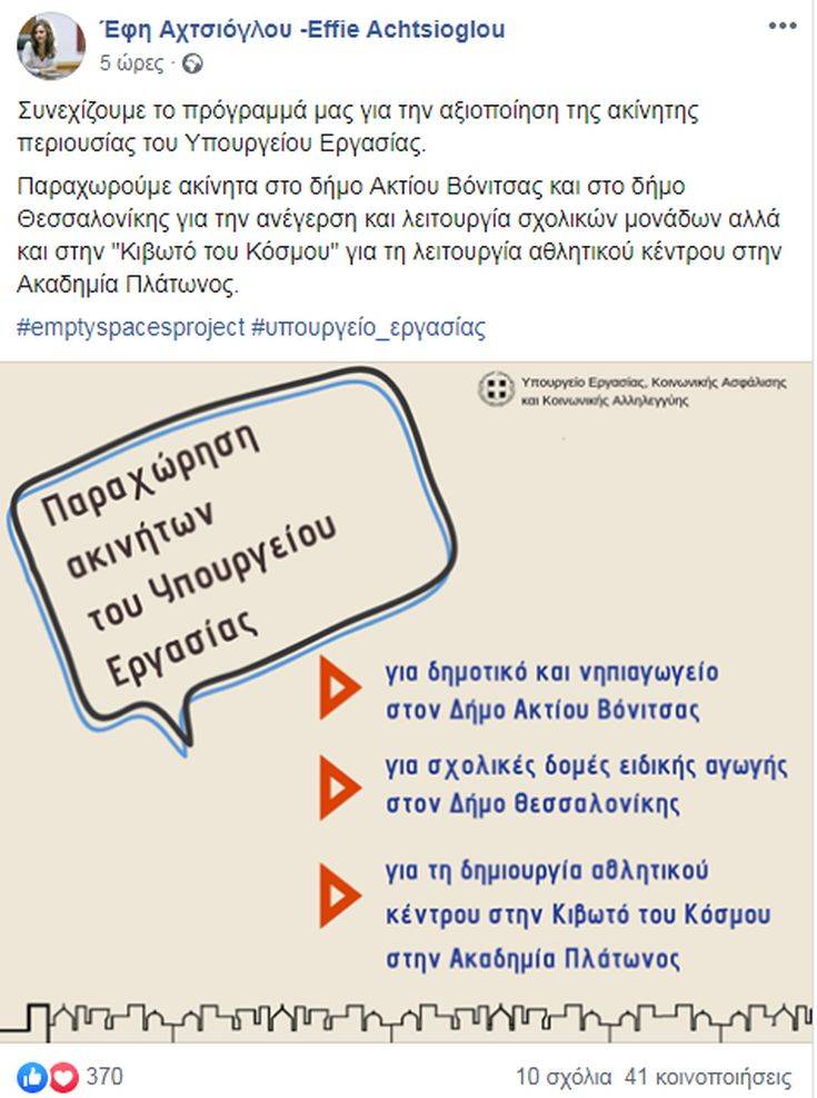 Συγκεκριμένα, η κ. Αχτσιόγλου έγραψε: «Παραχωρούμε ακίνητα στο Δήμο Ακτίου Βόνιτσας και στο Δήμο Θεσσαλονίκης για την ανέγερση και λειτουργία σχολικών μονάδων, αλλά και στην “Κιβωτό του Κόσμου” για τη λειτουργία αθλητικού κέντρου στην Ακαδημία Πλάτωνος».