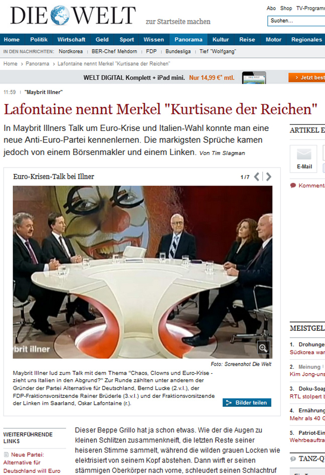 «Η Άνγκελα Μέρκελ είναι η πόρνη των πλουσίων στην Ευρώπη», είπε χαρακτηριστικά ο Λαφοντέν, πρώην επικεφαλής του SPD και και επικεφαλής του κόμματος WASG. Ο αριστερός πολιτικός προειδοποίησε, επίσης, ότι «η Ελλάδα βρίσκεται αντιμέτωπη με συνθήκες Βαϊμάρης!», αναφερόμενος στην πεπατημένη της λιτότητας και την κρίση του ευρώ.