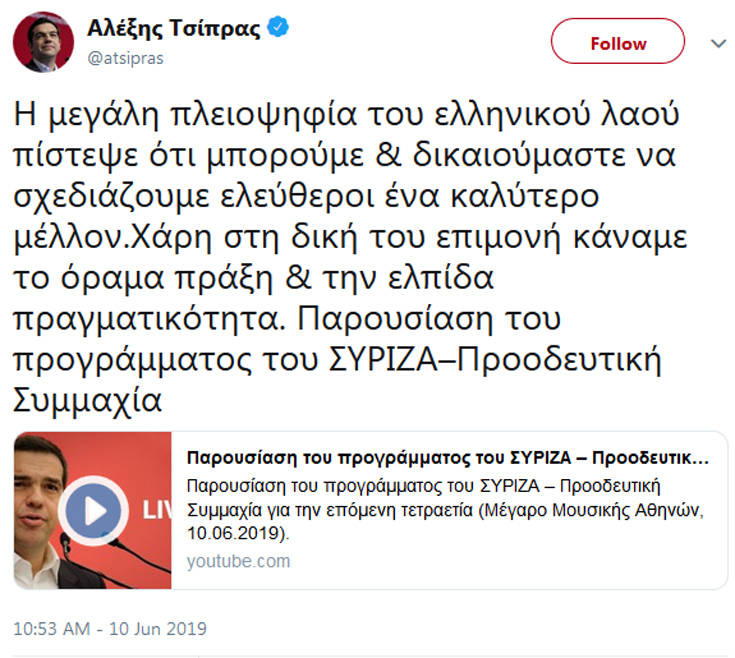 Αυτά αναφέρει ο πρωθυπουργός και πρόεδρος του ΣΥΡΙΖΑ Αλέξης Τσίπρας με ανάρτησή του στο Twitter με αφορμή την παρουσίαση του προγράμματος του ΣΥΡΙΖΑ–Προοδευτική Συμμαχία.