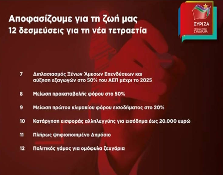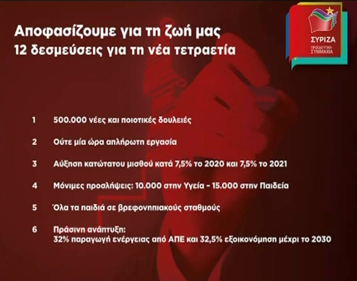Ο Αλέξης Τσίπρας από το βήμα ανέλυσε τα 12 σημεία του προγράμματος του ΣΥΡΙΖΑ. «Μεγάλος εθνικός μας στόχος να ανακτήσουμε την κανονικότητα στην αγορά εργασίας.